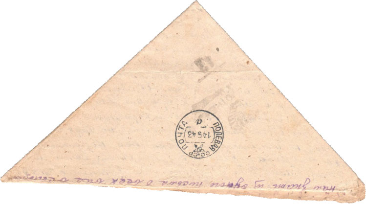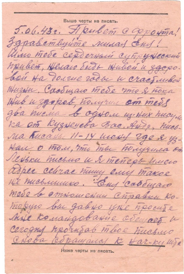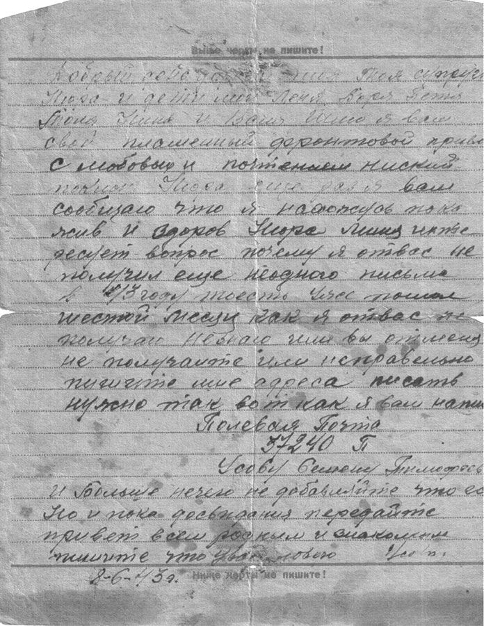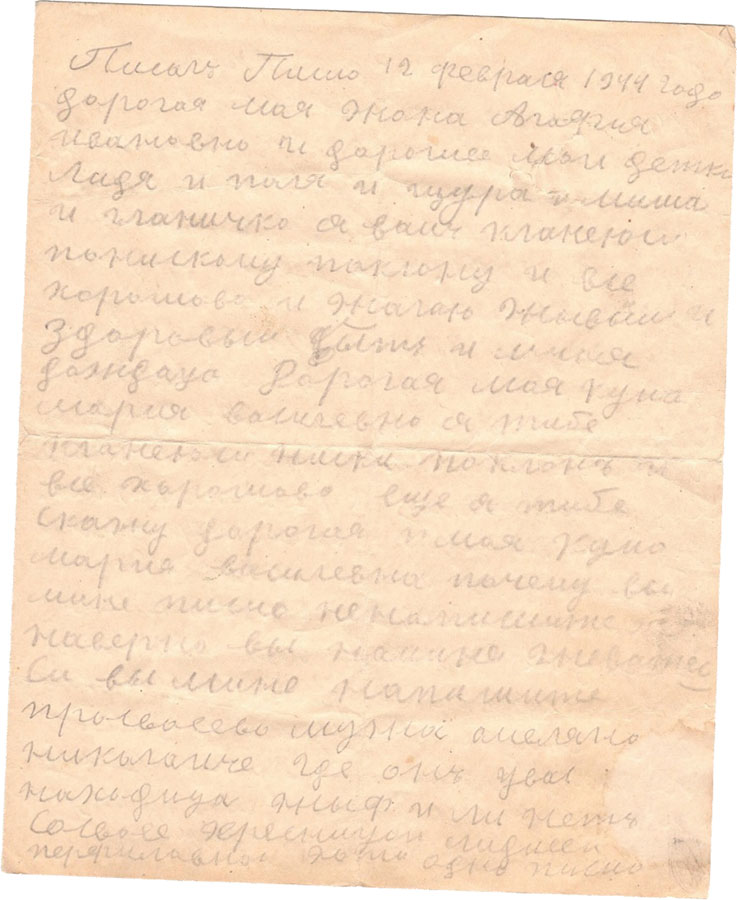 Добрый день дорогая моя супруга Нюра и дети мои Лёня, Боря, Петя, Толя, Нина и Ваня. Шлю я вам свой пламенный фронтовой привет с любовью и почтением низкий поклон. Нюра еще раз я вам сообщаю что я нахожусь пока жив и здоров. Нюра меня интересует вопрос почему я от вас не получил еще ни одного письма. В 43 году тоесть. Уже пошел шестой месяц как я от вас не получаю. Не знаю или вы от меня не получаете или неправильно пишите мне адреса нужно писать так как вот я вам написал