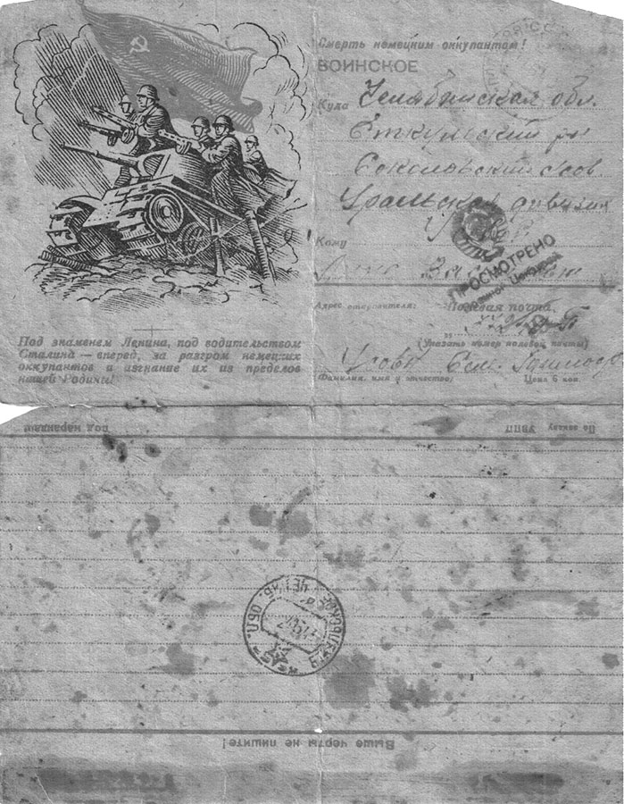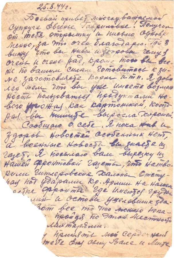 Боевой привет многоуважаемая супруга Евгенья Гавриловна! Получил от тебя открытку и письмо одновременно, за что очень благодарю. Где я вижу что вы живы и здоровы чему я очень и очень рад, кроме того вы все же по вашим силам готовитесь к зим, заготовляете корм и т.п. Я доволен тем что вы уже имеете возможность пользоваться продуктами нового урожая как картошкой, которая вы пишите выросла хорошей. Сообщаю о себе. Я пока жив и здоров новостей особенных нет, а военные новости вы знаете из газет. Я посылаю вам вырезку из нашей фронтовой газеты, что натворили гитлеровские халопы отступая под ударами Кр.армии на нашем участке фронта где имеются груды (разва)лин и остовы уцелевших зда(ний)… Вот все то что можно попа (…)