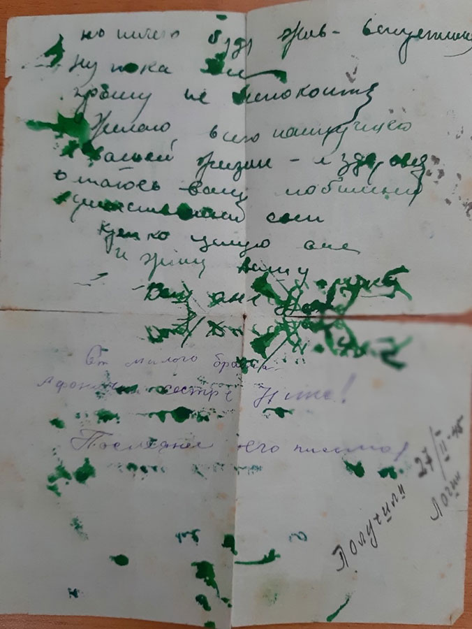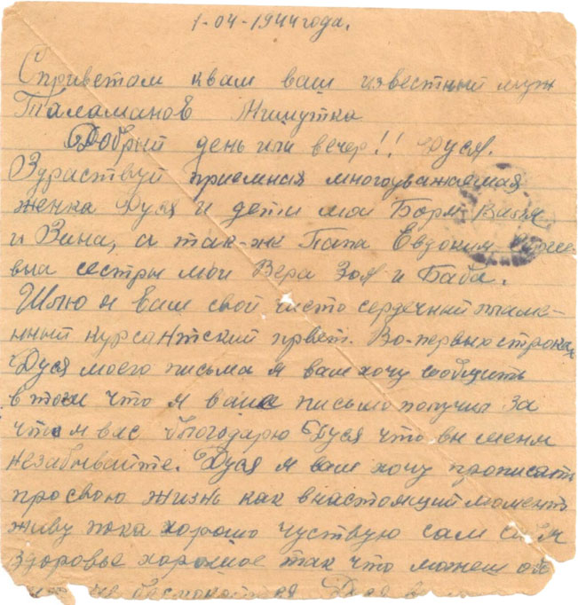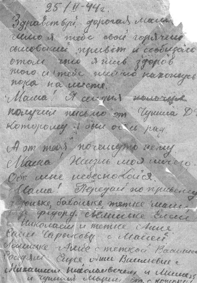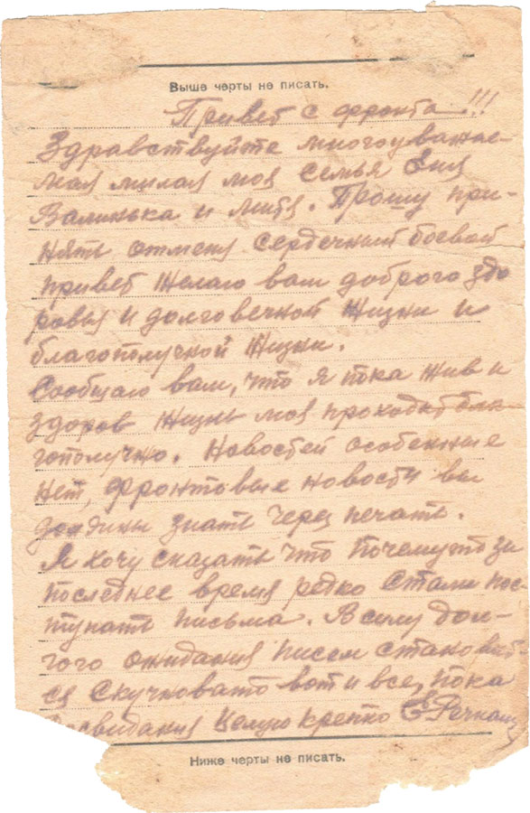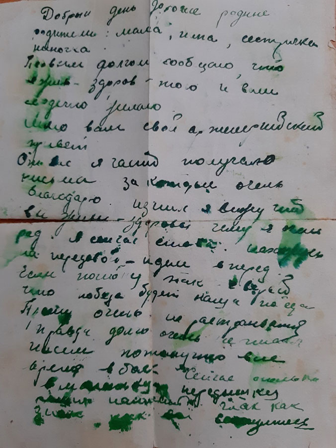 Добрый день дорогие родные родители: мама, папа, сестренка Ниночка. Первым делом сообщаю, что я жив-здоров, чего и вам сердечно желаю. Шлю вам свой гвардейский привет. От вас я часто получаю письма за которые очень благодарю. Из них я вижу что вы живы-здоровы чему я очень рад. Я сейчас опять нахожусь на передовой. Идем вперед. Если погибну так с верой что победа будет наша наша(…) Прошу очень не расстраиваться. Правда долго очень не писал совсем потому что все время в боях. Сейчас только в маленькую передышку (…) нашлась (…) как (…)