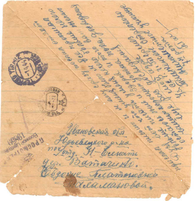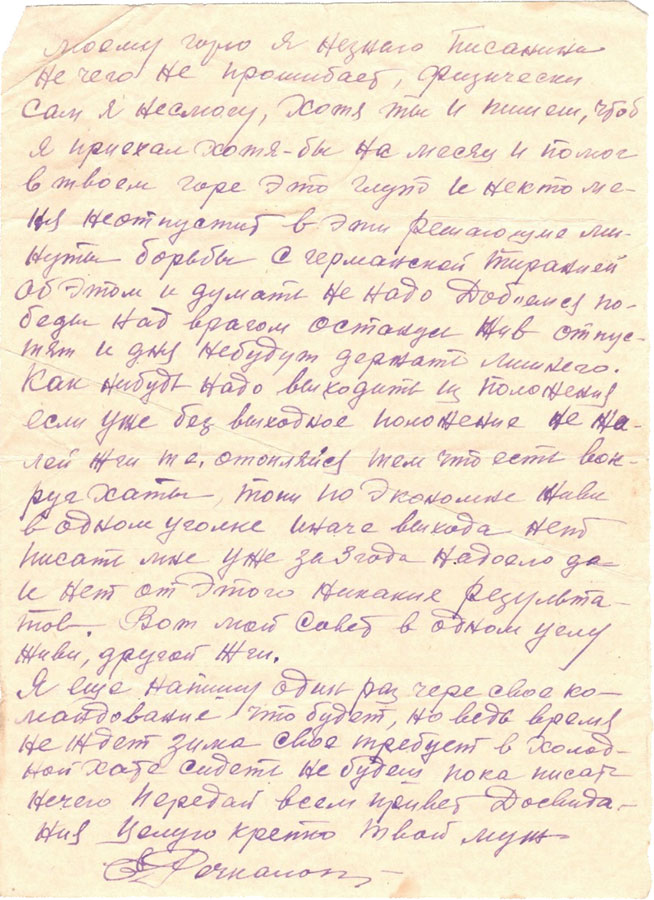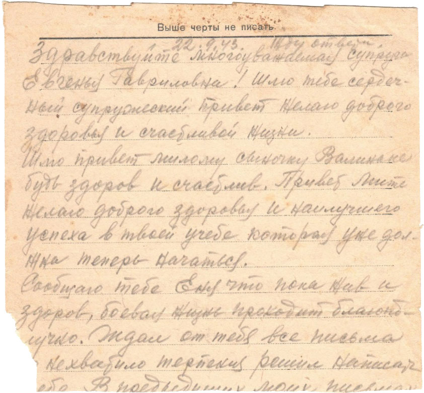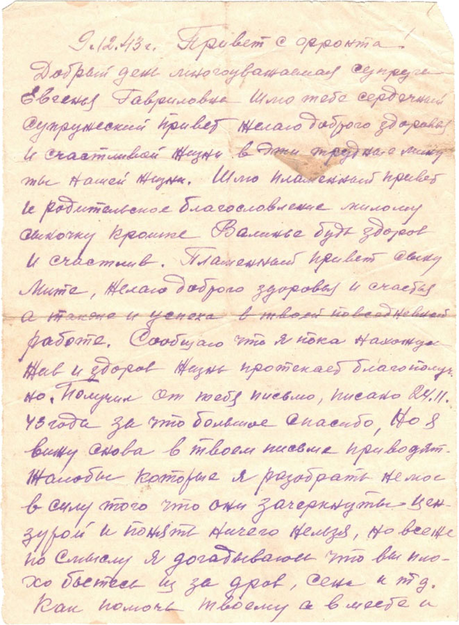 Добрый день многоуважаемая супруга Евгенья Гавриловна Шлю тебе сердечный супружеский привет желаю доброго здоровья и счастливой жизни в эти трудные минуты нашей жизни. Шлю пламенный привет и родительское благословление милому сыночку крошке Валиньке будь здоров и счастлив. Пламенный привет сыну Мите, желаю доброго здоровья и счастья а также и успеха в твоей повседневной работе. Я сообщаю что я пока нахожусь жив и здоров жизнь протекает благополучно. Получил от тебя письмо, писано 24.11.43года за что большое спасибо, но я вижу снова в твоем письме приводятся жалобы которые я разобрать не могу в силу того что они зачеркнуты цензурой и понять ничего нельзя, но все же по смыслу я догадываюсь что вы плохо бьетесь щ за дров, сено и тд. Как помочь твоему а вместе и моему горю я незнаю Писанина не чего не прошибает, физически сам я несмогу, хотя ты и пишеш, чтоб я приехал хотя бы на месяц и помог в твоем горе Это глупо и некто меня неотпустит в эти решающие минуты борьбы с германской тиранией об этом и думать не надо Добьемся победы над врагом останусь жив отпустят и дня небудут держать лишнего. Как нибудь надо выходить из положения если уже безвыходное положение не жалей жгите отопляйся тем что есть вокруг хаты, толи по экономии живи в одном уголке иначе выхода нет писать мне уже за 3 года надоело да и нет от этого никаких результатов. Вот мой совет в одном углу живи, другой жги.