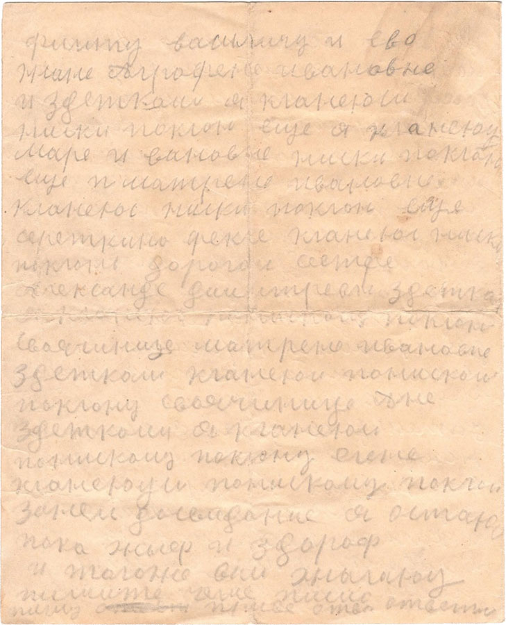 Дорогая моя жона Агафия Ивановна и дорогие мои детки Лида и Поля и Шура и Миша и Гланичка я вам кланеюс понискому поклону и все хорошово и жалаю жывым здоровым быть и меня дождаца. Дорогая моя кума Мария Васильевна я тибе кланеюси ниски поклонъ и все хорошово еще я тибе скажу дорогая моя кума Мария Васильевна почему вы мне не напишите наверно вы на мине гневаитеси вы мине напишите ( – ) муже омеляне николаиче где он у вас находица жыф или нету ( – -) Лидии Перфильевне хоть одно писмо.