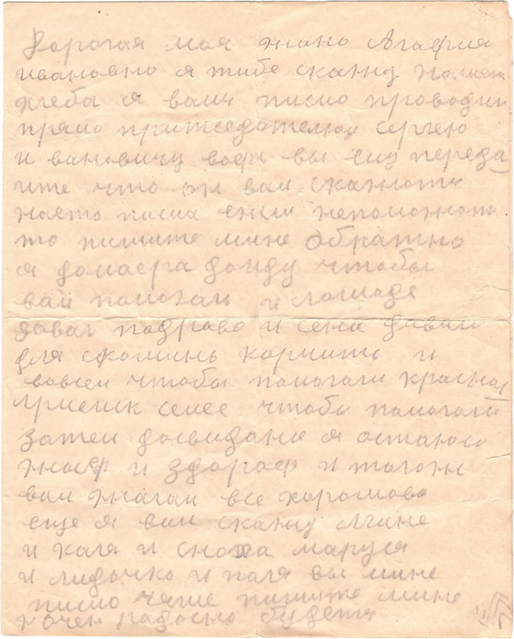 Дорогая моя жина Агафия Ивановна я тибе скажу нащет хлеба я ваше писмо проводил прямо притседателю Сергею Ивановичу ( – -) вы ему передадите что он вам скажетнаето писмо ежели непоможет то пишите мине обратно я до маера доду чтобы вам помогал и лошадь давал подрова и сена давал для скотин кормить и вовсем чтобы помогалкрасоармейск семье чтобы помогал затем досвидание я остаюсь жыф и здороф и тогоже вам жалаю все хорошово еще я вам скажу мине и коля и сноха маруся и лидочка и поля вы мне писмо чаще пишите мине очень радосно будет