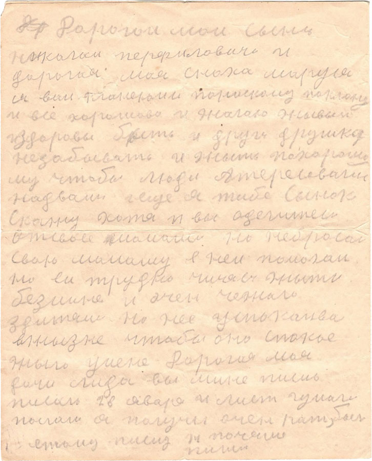 Дорогие мои сын Николка Перфильевич и дорогая моя сноха Маруся и вам кланеюси понискому поклону и все хорошова и жалаю живым и здоровы быть и друг друшку незабывать и жыть похорощому чтобы люди ( – -) над вами еще я тибе сынок скажу хотя вы и оделились от своей мамашии не помогал но ей трудно чичас жыть безминя и очен чижало здитямино нее успокаивай в жызне чтобы онаспокое жыла у мене. Дорогая моя дочь Лида вы мне письмо писали 28 января и лист гумаги послали я получил очень рат был приятному писму ты почаще пиши.