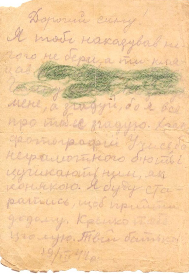 Я тобе наказував негого не бери, а ти кляцав (…) мене, а згидуй, бо я все про тоби згадую. Храни фотографии. Учись, бо неграмотного бьють i цугикають ним, як конякою. Я буду старатись, щоб прийти до дому. Крепко тобе цилую. Твей батько.