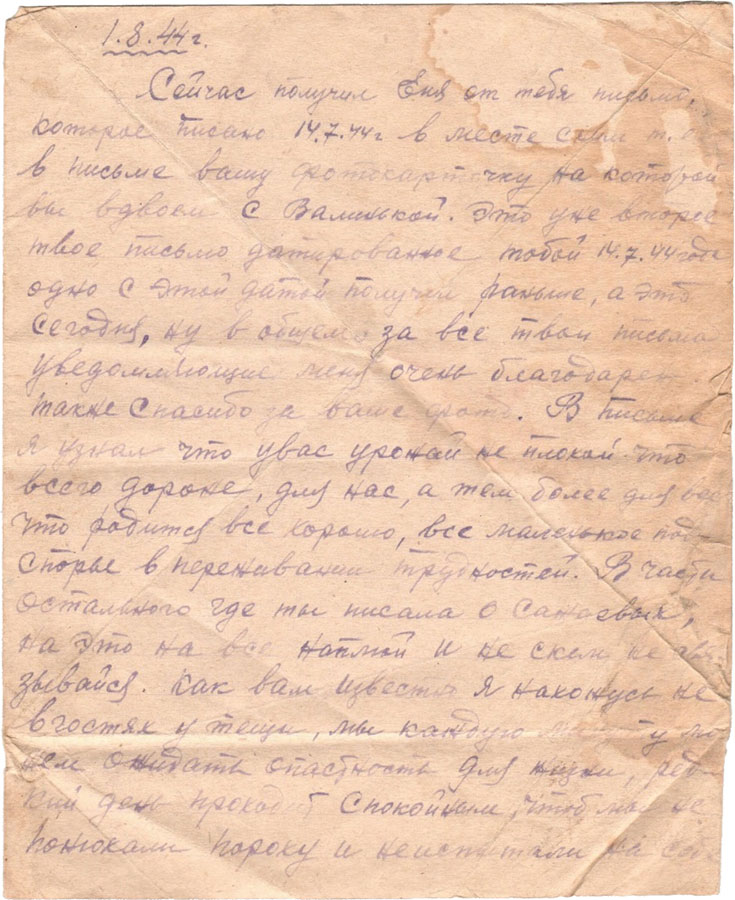 Сейчас получил Еня от тебя письмо которое писано 14.7.44 г вместе с ним т.е в письме вашу фотокарточку на которой вы вдвоем с Валинькой. Это уже второе твое письмо датированное тобой 14.7.44года одно с этой датой получил раньше, а это сегодня, ну в общем за все твои письма уведомляющие меня очень благодарен также спасибо за ваше фото. В письме я узнал что у вас урожай не плохой что всего дороже для нас, а тем более для вас, что родится все хорошо, все маленькое подспорье в переживании трудностей. В части остального где ты писала о Сажаевых, на это на все наплюйи не с кем не связывайся. Как вам известно я нахожусь не в гостях у тещи, мы каждую минуту можем ожидать опастность для жизни, редкий день проходит спокойным, чтоб мы не понюхали пороху и неиспытали на себе свинцового дождя и ураганного грома артиллерийского и минометного огня. Наше счастье и разговоры о жизни будут тогда когда мы придем к окончательной победе и останемся живы и здоровы. А тебя прошу меньше слушать разных сплетен а надеяться самой на себя, чтоб о тебе меньше люди говорили и вообще о нас с тобой, ты сама пишеш что если останемся живы то мы еще докажем людям, а в частности тем, которые болтают как надо жить. Вот с этим я согласен, этого и только этого надо добиваться. Пару слов в отношении наших ходатайств все дело впустую так что никого и ни по каким обстоятельствам с нашего фронта не отпускают. Вероятно и вы не слыхали такого случая кто бы приехал с нашего края буквально никто окромя ближних т.е. живущих близко от фронта, а дальние нет. Никто не ездил.