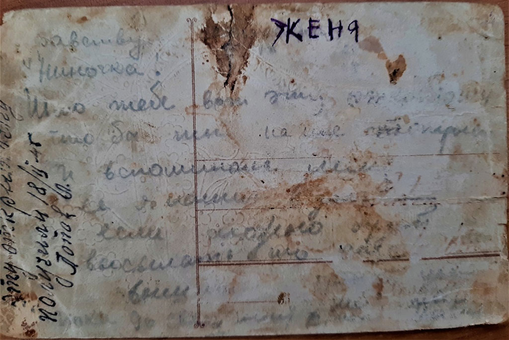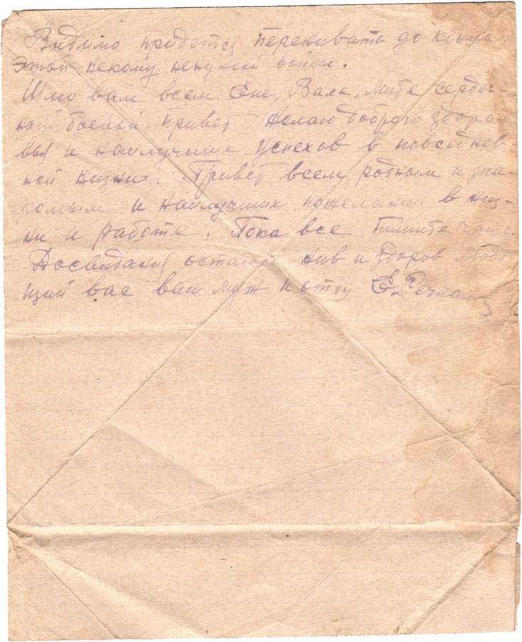 Шлю вам всем Ене, Вале, Мите сердечный боевой привет. Желаю доброго здоровья и наилучших успехов в повседневной жизни. Привет всем родным и знакомым и наилучших пожеланий в жизни и работе. Пока все пишите чаще Досвидания остаюсь жив и здоров любящий вас ваш муж и отец (подпись)