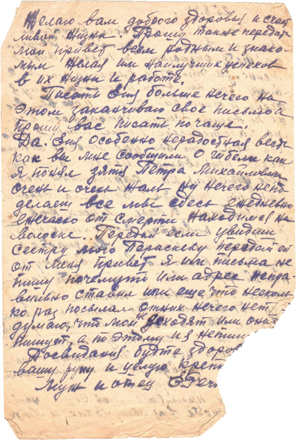 Да. Еня особенно нерадостная весть как вы мне сообщили о гибели как я понял зятя Петра Михайловича Очень и очень жаль ну нечего неподелаеш все мы здесь ежедневно и ежечасно от смерти находимся на волоске. Предай если увидишь сестру мою Параскеву Передай от меня привет я им письма не пишу почемуто или адрес неправильно ставил или еще что несколько раз посылал от них нечего нет думаю, что мои не доходят или она не пишут а поэтому и я непишу