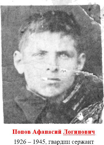 Попов Афанасий Логинович. 31.01.1926, Челябинская обл., Еткульский р-н, с. Емантелинка, призван: __.__.1943, Еткульский РВК, Челябинская обл., Еткульский р-н, 159 сд, мл. сержант, убит 09.02.1945, первичное место захоронения: Восточная Пруссия, Кенигсбергский окр., г.дв. Глаутинен, 300 м, опушка леса.