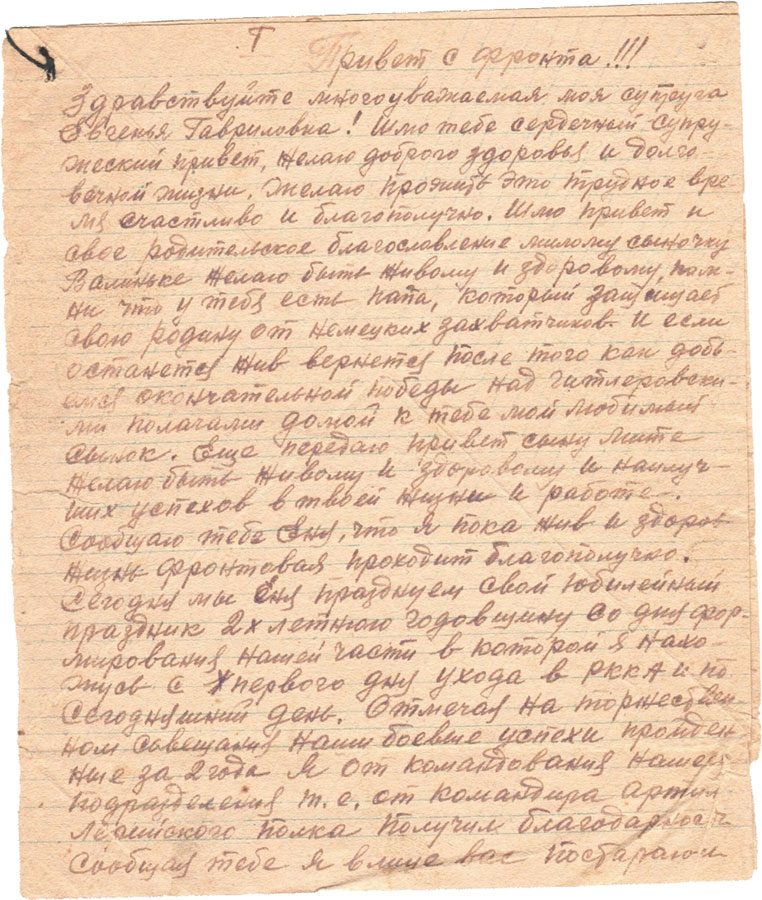 Здравствуйте многоуважаемая моя супруга Евгенья Гавриловна! Шлю тебе сердечный супружеский привет, желаю доброго здоровья и долговечной жизни. Желаю прожить это трудное время счастливо и благополучно. Шлю привет и свое родительское благосовление милому сыночку Валиньке желаю быть живому и здоровому, помни что у тебя есть папа, который защищает свою родину от немецких захватчиков и если останется жив вернется после того как добьемся окончательной победы над гитлеровскими палачами домой к тебе мой любимый сынок. Еще передаю привет сыну Мите желаю быть живому и здоровому и наилучших успехов в твоей жизни и работе.