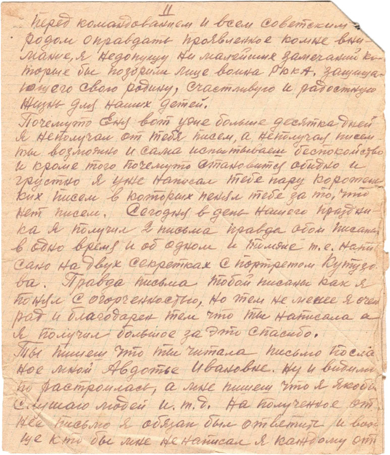 Почемуто Еня вот уже больше десятка дней я неполучал от тебя писем, а неполучая писем ты возможно и сама испытываешь беспокойство и кроме того почемуто становится обидно и грустно я уже написал тебе пару коротких писем в которых пенял тебе за то, что нет писем. Сегодня в день нашего праздника я получил 2 письма правда обои писаны в одно время и об одном и том же т.е. написано на двух секретках с портретом Кутузова. Правда письма тобой писаны как я понял с огорченностью, но тем не менее я очень рад и благодарен тем что ты написала а я получил большое за это спасибо.