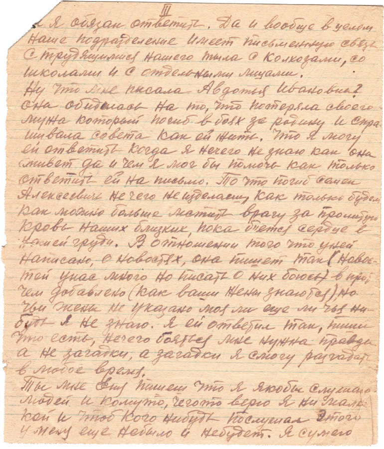 Ты пишеш что ты читало письмо посланное мной Авдотье Ивановне. Ну и видимо растроилась, а мне пишеш чтоя якобы слушаю людей и т.д. На полученное от нее письмо я обязан был ответить и вообще кто бы мне не написал я каждому от я обязан ответить. Да и вообще в целом наше подразделение имеет письменную связь с трудящимися нашего тыла с колхозами, со школами и с отдельными лицами.Ну что мне писала Авдотья Ивановна? Она обиделась на т, что потеряла своего мужа который погиб в боях за родину и спрашивала совета как ей жить. Что я могу ей ответить когда я нечего не знаю как она живет да и чем я мог бы помочь как только ответить ей на письмо. То что погиб Семен Алексеевич нечего не изделаеш, как только будем как можно больше мстить врагу за пролитую кровь наших близких, пока бьется сердце в нашей груди.В отношении того что у ней написано, о новостях, она пишет так (новостей у нас много но писать о них боюсь) впрочем добавлено (как ваши жены знаются), но чьи жены не указано моя ли еще чья нибудь я не знаю. Я ей ответил так, пиши что есть, нечего бояться бояться мне нужна правда а не загадки, а загадки я смогу разгадать в любое время.