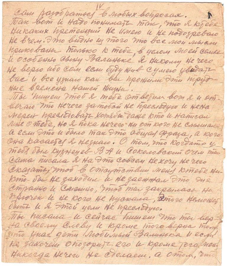 Так вот и надо понимать так, что я к тебе никаких претензий не имею и не подозреваю не в чем. Это видно из того что все мои мысли прикованы только к тебе, в целом моей семье и особенно сыну Валиньке я никому нечего не верю ибо сам если буду жив сумею увидать вас и все узнаю как вы прожили эти трудные времена нашей жизни.