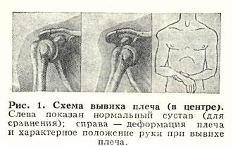 (рис. 1) составляет более половины всех травматических вывихов. Для него характерна резкая боль и полное отсутствие движений в плечевом суставе, изменение формы его по сравнению со здоровым. Плечо на больной стороне кажется удлиненным, обычно отведено от туловища. Больной наклоняется в сторону поврежденной руки и поддерживает поврежденную конечность за локоть или предплечье. Доврачебная помощь – подвешивание руки на косынку и скорейшее направление к врачу.