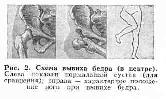 (рис. 2) возникает под действием большой силы. Признаки: резкая боль в области тазобедренного сустава, неподвижность его, полная невозможность пользоваться конечностью. Колено пострадавшей конечности несколько повернуто внутрь, к здоровой ноге, и приведено к ней; реже бывает поворот кнаружи с отведением вывихнутого бедра в сторону от здорового бедра. Больные лежат на спине или на здоровом боку.