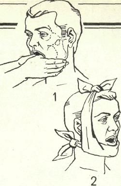 Вывих, кроме травматического вывиха, можно вправить на месте. Больного сажают. Оказывающий помощь становится лицом к пострадавшему. Обертывает большие пальцы рук бинтом или материей и вводит их в рот пострадавшего, надавливая на углы нижней челюсти (задние коренные зубы). Смещая нижнюю челюсть вниз и назад, одновременно остальными пальцами приподнимает подбородок (рисунок 1). При травматическом вывихе необходимо прикрыть рот пострадавшего платком, наложить повязку (рисунок 2), удерживающую челюсть, и доставить пострадавшего в больницу.