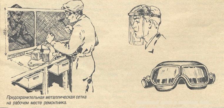 Не меньшее значение имеют и хорошие гигиенические условия в производственных помещениях. Здесь надо постоянно следить за правильным и достаточным естественным и искусственным освещением, за бесперебойной работой приточно-вытяжной вентиляции. В помещениях не должно быть захламленности, загромождения проходов машинами и деталями. Надежнее всего предупредить повреждение органов зрения удаётся благодаря специальным, плотно прилегающих к лицу, защитным очкам. Выпускают много их видов. Одни очки служат для защиты глаз от ветра, пыли, мелких стружек, другие – от попадания мелких и средних металлических частиц, третьи предохраняют от агрессивных жидкостей, четвёртые являются экраном, ограждающим глаза от ультрафиолетовых лучей. Каждый работник должен обязательно надевать защитные очки, причём именно те, которые необходимы в конкретной ситуации. Практика показала: что там, где это стало правилом, работники надёжно ограждены от лёгких и тяжелых травм глаз