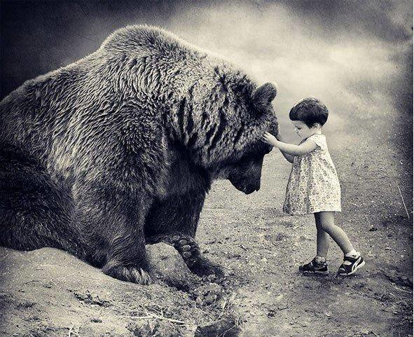 Мохнатый зверь, а с ним ребёнок,Так много нежности в душе…Медведь конечно не котёнок,«Чёрт косолапый» – как клише.А в сказках старых: робкий добрый,Могуч, как дуб, врагам скала,Хотя и вес, и рост огромный,В глазах есть боль и глубина…Что их связало, что разлучит?Не знаем мы, им не до нас,Ведь их ласкает солнца лучик,Они так счастливы сейчас!П.В.М. 16.08.2016г
