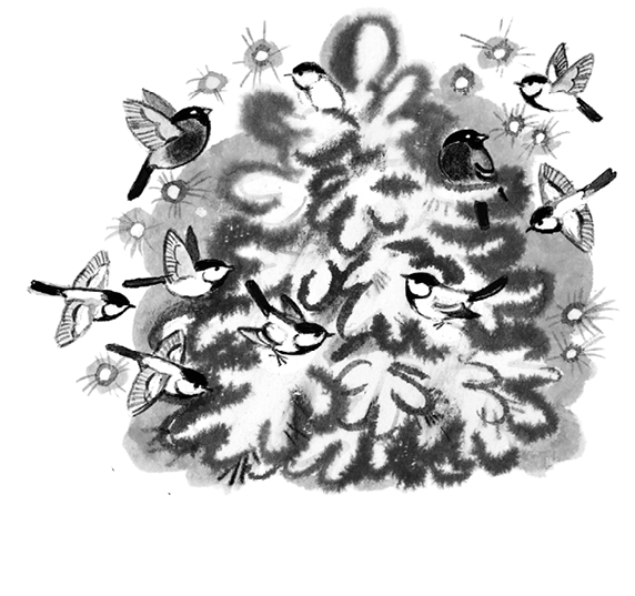 Разместил Дедушка Мороз гостинцы – самому понравилось. Ёлочка вся заиграла, закокетничала. Эту её перемену все лесные жители приметили. Вон уже синицы по веткам скачут, к кренделям подбираются. И белки, и зайцы не прочь полакомиться. Да что там, сам серый волк к ёлочке пожаловал.