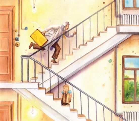 На лестнице Петька отстал от Детского Доктора. Детский Доктор, как мальчишка, прыгал через две ступеньки. А Петька, как старый старичок, еле тащился вверх по лестнице, дрожащей рукой цепляясь за перила.