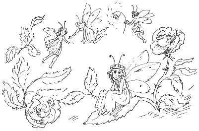 Множество эльфов в разноцветных одежках порхали над цветами.