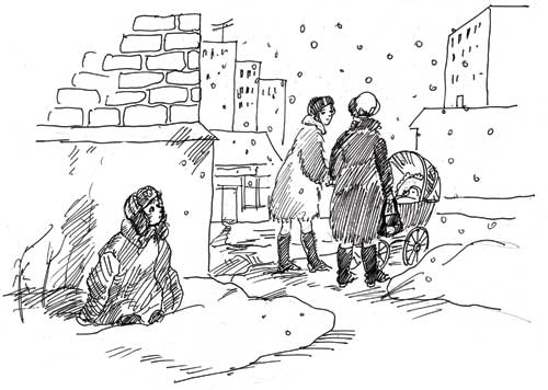 Она взялась за ручку коляски. Коляска, приятно поскрипывая, покатилась. Две шубки, светлая и тёмная, скрылись. Снег пошёл ещё гуще, засыпая всё кругом.