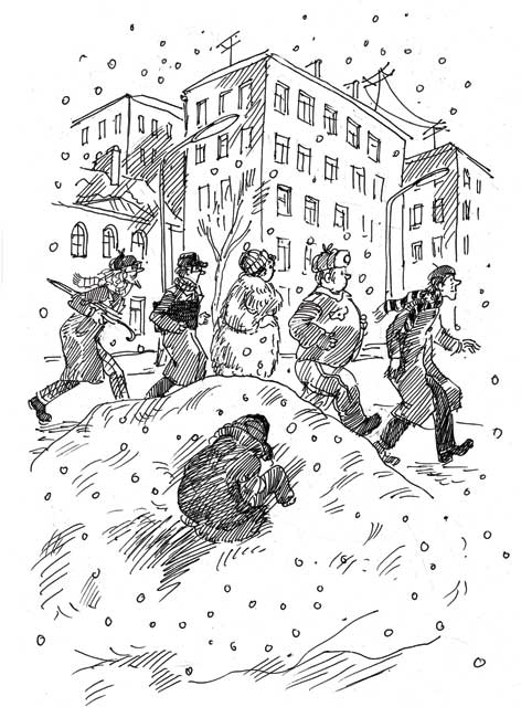 Вова попробовал сползти с сугроба, но только провалился весь в своё пальто. Большая ушанка свалилась с его маленькой головы и упала прямо на тротуар.
