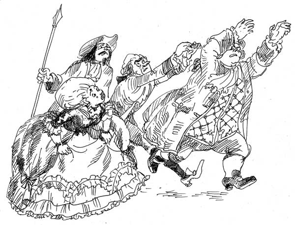 Но вот на площадь вышел палач. Весь в чёрном, в чёрном длинном капюшоне. Ни на кого не глядя, тяжёлым шагом он медленно поднялся на помост и встал неподвижно, опершись обеими руками о топор.