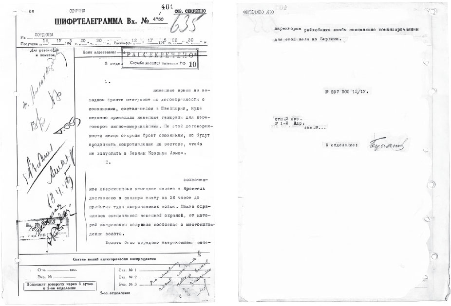 Сегодня у нас есть документальные свидетельства того, чем расплачивался фашистский режим с британцами и США, – это рассекреченные шифртелеграммы из архива СВР. В них ответ, и он поистине страшен. 12 апреля 1945 года, за три недели до капитуляции, оперативный сотрудник под псевдонимом Боб сообщает в центр о золоте, которое фашистская Германия собиралась тайно передать Великобритании. Но оно попало в руки американцам: «Захваченное американцами немецкое золото в Брюсселе доставлено в соляную шахту за 36 ч до прибытия туда американских войск. Шахта охранялась специальной немецкой охраной, от которой американцы получили сообщение о местонахождении золота. Золото было передано американцам вице-директором Рейхсбанка, якобы специально командированным для этой цели из Берлина».