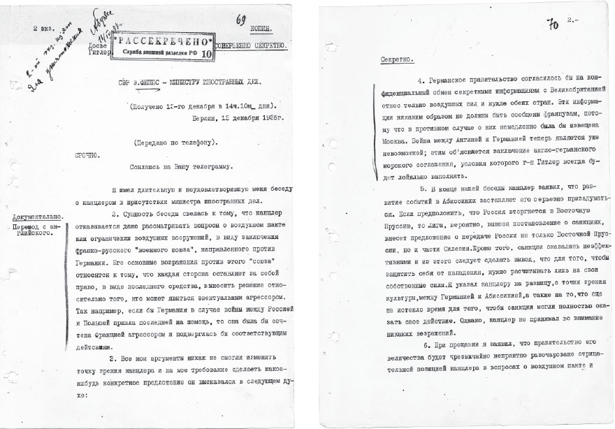 Однако лишь недавно историкам стало известно, что были и дополнительные, секретные соглашения. Вот перевод рассекреченного сообщения № 33 7-го отдела МИД Великобритании о переговорах с Гитлером о воздушном пакте от 13 декабря 1935 года: «Германское правительство согласилось бы на конфиденциальный обмен секретной информацией с Великобританией относительно воздушных сил и нужд обеих стран. Эта информация никоим образом не должна быть сообщена французам, потому что в противном случае о ней немедленно была бы извещена Москва. Война между Англией и Германией теперь является уже невозможной. Этим объясняется заключение Англо-германского морского соглашения, условия которого господин Гитлер всегда будет лояльно выполнять».