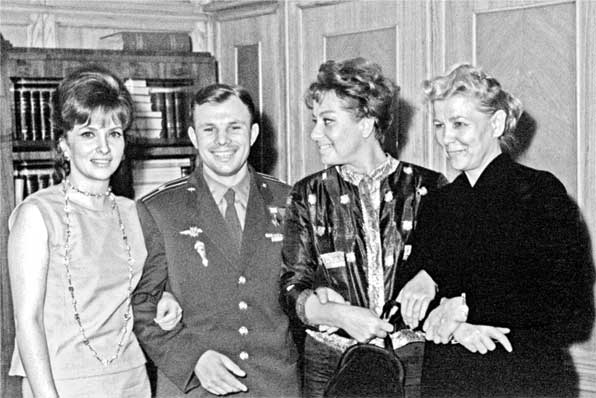 Джина Лоллобриджида (слева) и Мариза Мерлини (вторая справа) во время приема в Министерстве культуры СССР с космонавтом Ю. Гагариным