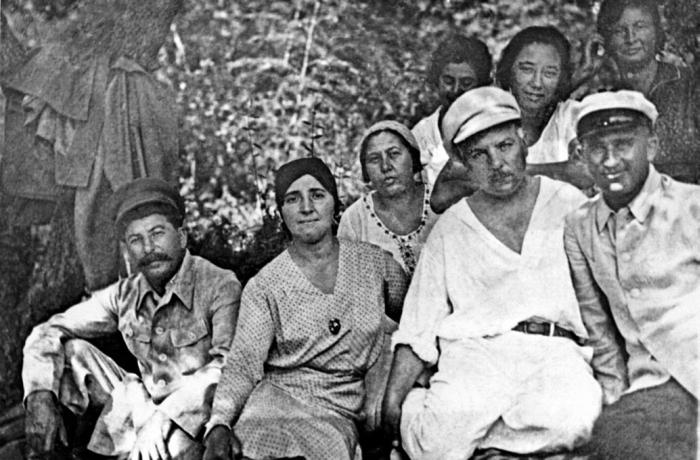 И.В. Сталин, его жена Надежда Аллилуева, К.Е. Ворошилов (слева направо) на отдыхе. Начало 1920-х годов