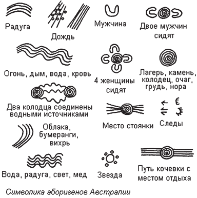 – четыре брачных класса. У большинства аборигенов Австралии половины каждого племени подразделялись на два брачных класса. Таким образом, в каждом племени существовало четыре брачных класса. Мужчина из класса А. мог взять в брак женщину из класса В, а ребенка отдать в класс С. Таким образом племена избегали кровосмешения и подтверждали свое убеждение в священнодействии числа четыре и сакральности формы квадрата. Обратите внимание, что чаще всего в изображении явлений природы или действий человека используется именно четыре линии.