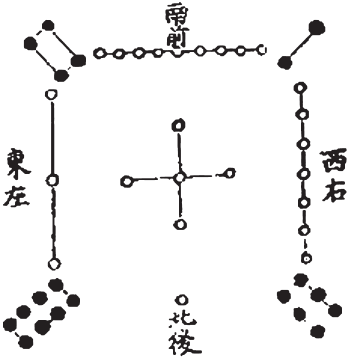 Каждая отдельная окружность символизировала солнце, каждая обозначала бога. Четыре точки, расположенные на вершинах квадрата, являлись не чем иным, как частями центральной, частями главного божества. Четыре бога по углам мира объединяются в едином божестве – Тсакол, Битол, Алом и Каналом.