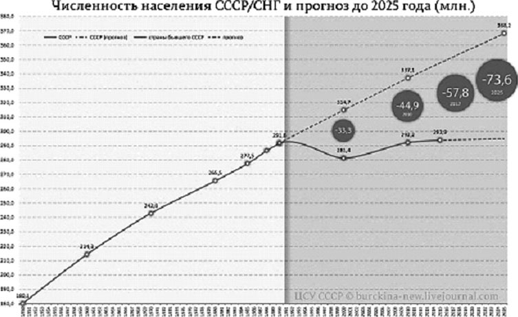 В своих трудах он указывал на недостатки в этой сфере, которые явственно присутствуют и в новейшей истории России: «Многие из окончивших у нас средние учебные заведения за последнее время лишены даже настоящей грамотности, то есть не умеют писать как следует. А высшие учебные заведения подготовляют таких практических деятелей, особенно нужных в настоящее время России, которые зачастую не любят своего дела, плохо понимают русские местные потребности и не умеют их изучить сколько-нибудь самостоятельно и разумно к ним приноровляться». Он надеялся, что это положение будет исправлено, но, как видим из всего происходящего в наши дни, по прошествии более чем 100 лет мы вновь пришли все к тем же проблемам, решать которые жизненно необходимо для восстановления крепости былой России не завтра, а здесь и сейчас. Отсюда следует и несбыточность приведенного выше демографического прогноза Дмитрия Ивановича Менделеева. Более того, согласно оценкам ряда отечественных экспертов, численность народов СССР в 2000 году должна была составить 315 000 000 человек, но в реальности была куда меньше – 281 000 000 человек, то есть снизилась с 1990 года, года слома прежней цивилизационной модели, на 10 000 000 человек, а демографические потери в итоге составили 33 300 000 человек. В 2010 году потери составили уже 45 000 000 человек, к 2017 году – 58 000 0000 человек, а к 2025 году, по прогнозам тех же экспертов, составят 74 000 000 безвозвратных потерь. Планомерная гибель нации очевидна. Программу недоброжелателей России следует признать по-прежнему успешной.