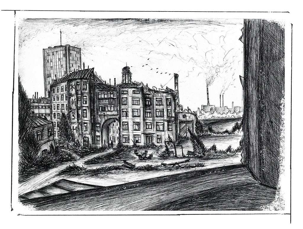 И вот, уже гнездятся вороны на одиноком уцелевшем балконе, что выходит на перекрёсток к руинам, покосившимся фонарным столбам и томно-серому небу над проседающими крышами. Изредка парят над поникшими кварталами и оседают на помойных баках у алкогольного магазина неподалёку.