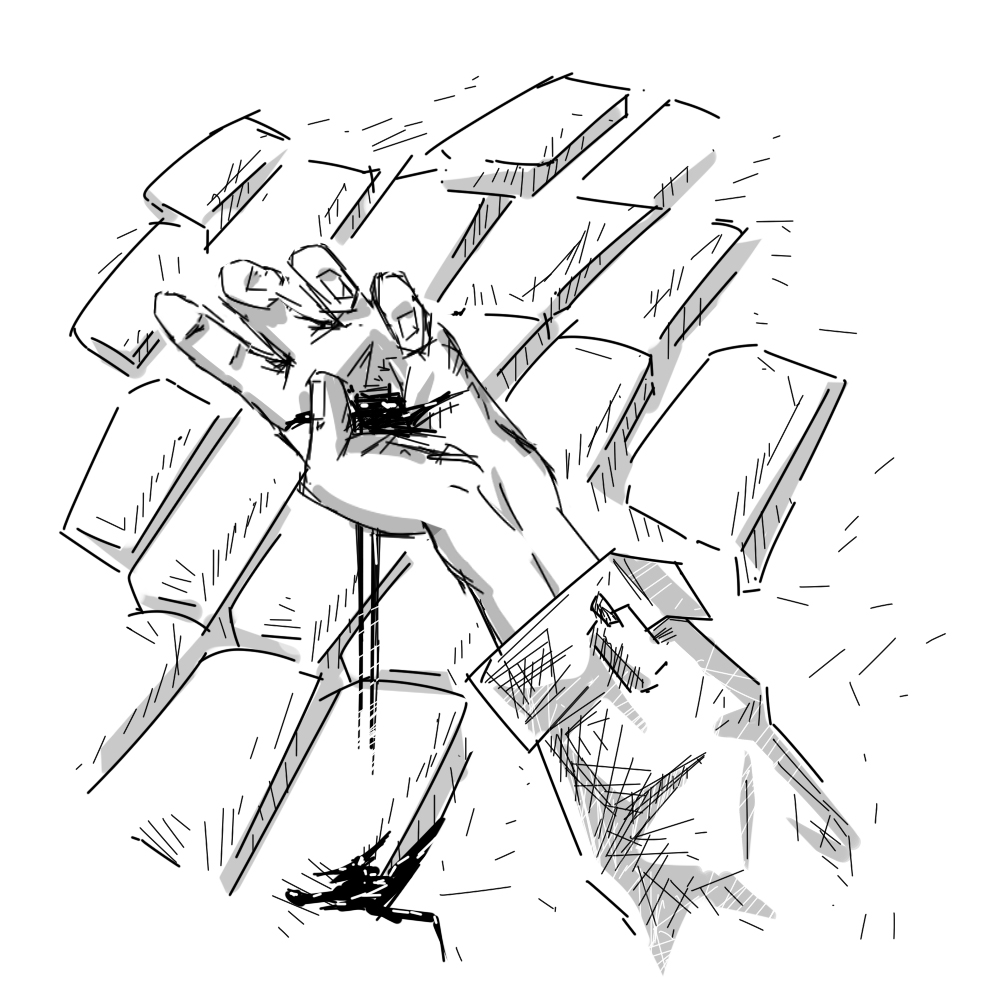 Ладонь, протягиваясь, принимает мокрые удары. Кровь из раны разжижается, теряя контрастность.
