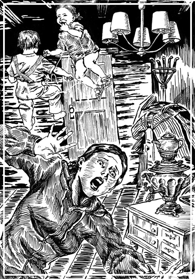 Свет в детской гаснет. Старый дом скрипит, и кажется, будто по чердаку кто-то ходит. Дядя все еще висит сверху. Его видно в слабых отблесках уличного фонаря, свет которого проникает через щелочку в плотных шторах. Глаза Ленки слипаются.