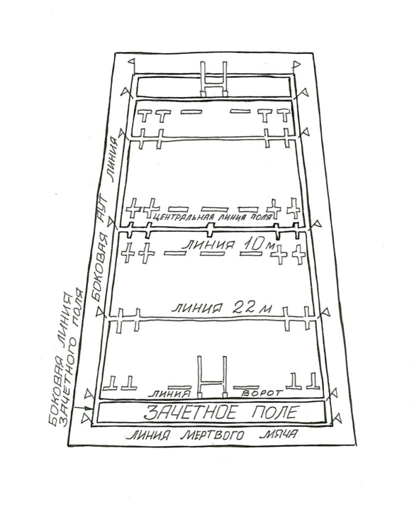 На поле имеется разметка сплошными линиями (центральная линия поля, боковые линии, линии ворот, линии 22 метров, линии мертвого мяча и боковые линии зачетного поля) и пунктирными.