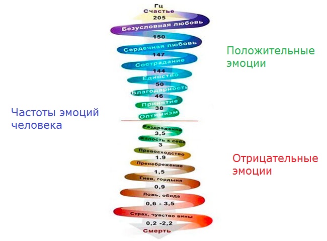 Ты тут не хохми, хорошо смеётся тот, кто смеётся как лошадь – а у тебя это плохо получается. Я речь веду о вибрациях мыслей, которые порождают эмоции. Думаешь негативно – низкие вибрации, позитивно – высокие. Я тут в сети картинку нашёл, там описаны эмоции и частота вибраций которая им соответствует. Сколько герц и какая эмоция. Интересная тема.