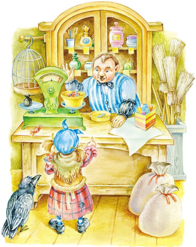 Так они добрели до края деревни и вошли в магазин мелочного торговца Балду́ина Пфе́фферкорна. И господин Пфефферкорн, конечно, вовсе не удивился тому, что в его лавку вошла Маленькая Баба-Яга с говорящим вороном на плече.