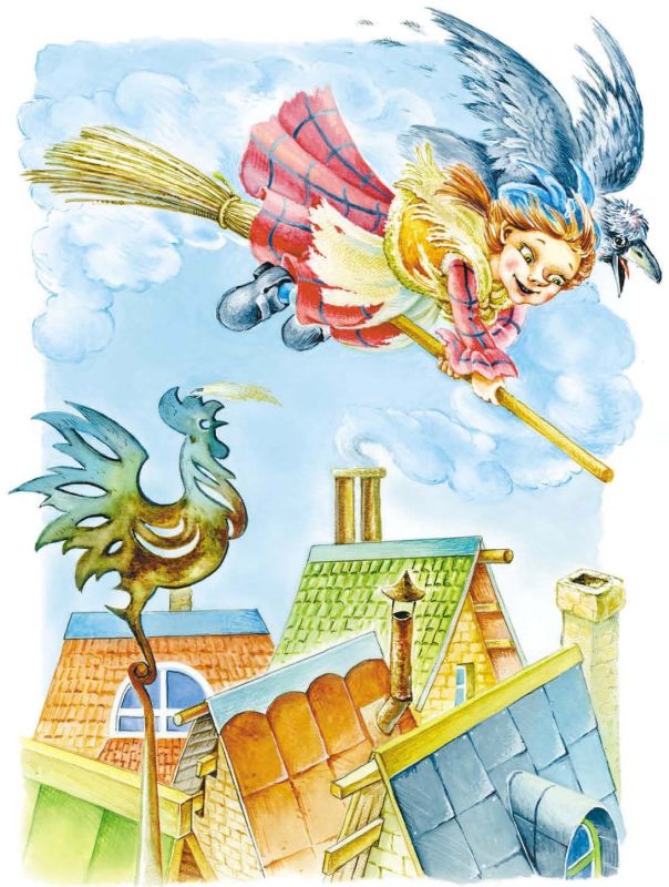 Как вихрь помчалась Маленькая Баба-Яга на новой метле. Вот она уже над крышами деревни. Ворон Абрахас с трудом удерживался у неё на плече, судорожно цепляясь за платье.