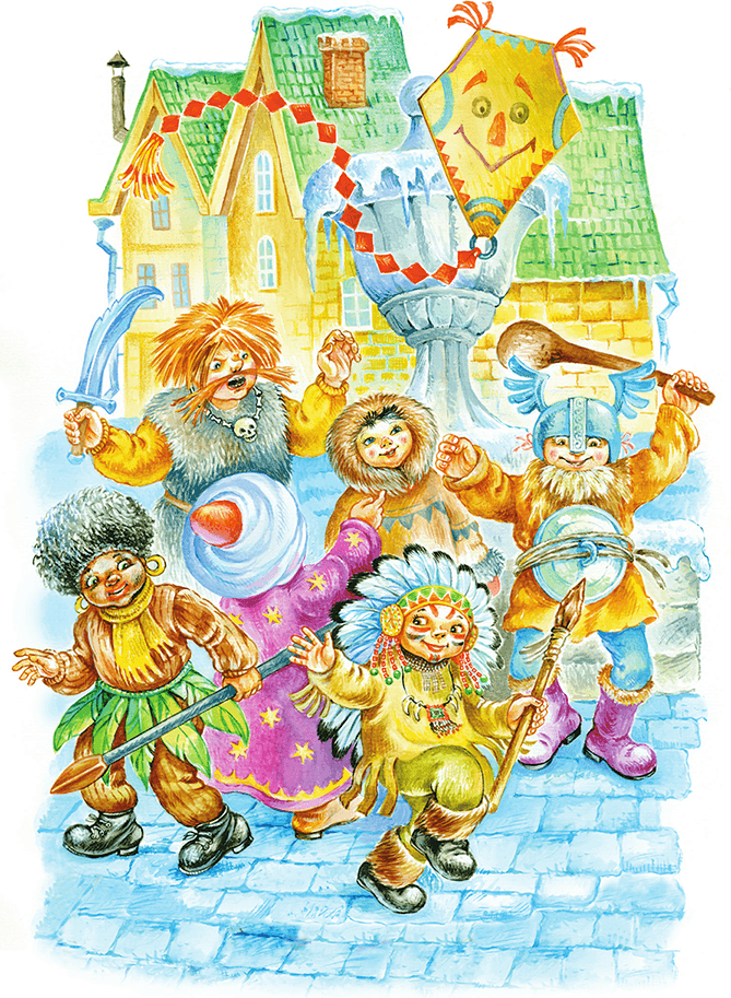Как попали негритята на заснеженную деревенскую улицу? С каких пор разгуливают здесь индейцы и турки? Индейцы – с перьями на шапках, с разрисованными лицами, и турки – в красных фесках с кисточками и в широченных шароварах.
