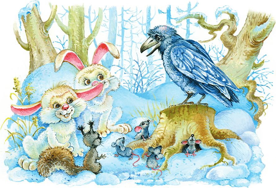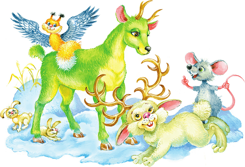 Косулям она наколдовала красную, голубую и зелёную, как трава, шерсть. А белочкам приделала вороньи крылья.