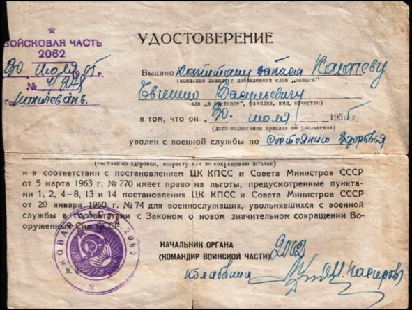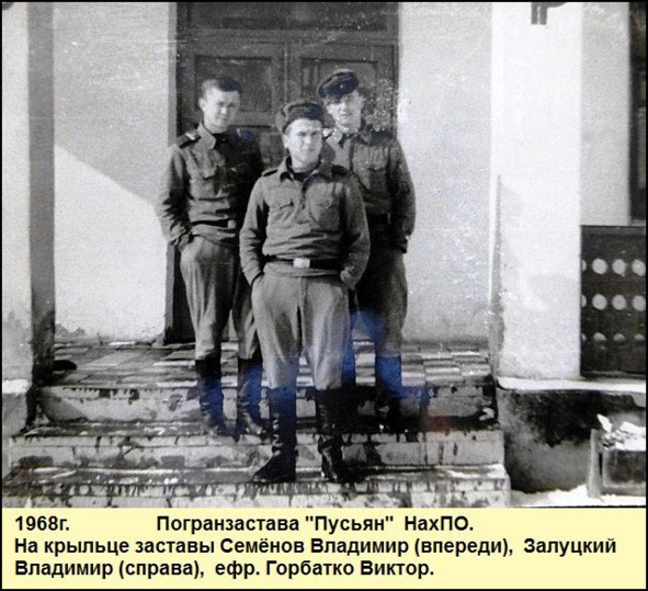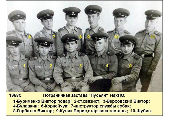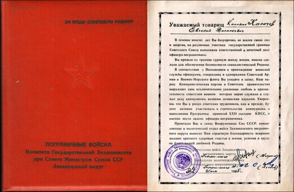 Первого октября, а это мой день рождения, я был уволен. Когда наша партия увольняемых ехала на поезде в отряд, было уже темно, а граница вся горела огнями по пути движения состава – это были проводы со стороны оставшихся продолжать службу. 2 октября 1968 года, получив документы увольнения, я покинул пределы войсковой части 2062 – нашего пограничного отряда. Сопровождающим нашей группы уволенных был мой первый начальник заставы, теперь уже подполковник Евдошенко Н. Н.
