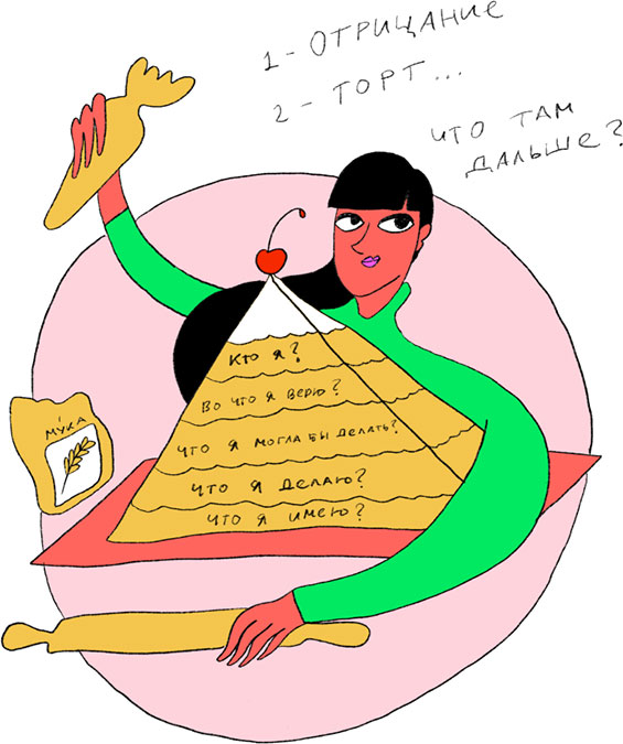 Однако в этот раз она решила не просто сублимировать свою экзистенциальную разочарованность в кондитерскую практику, но и освоить теорию Дилтса, сделав свой торт похожим на пирамиду и применив занудные логические уровни в гораздо более прикладном формате – на десерт.
