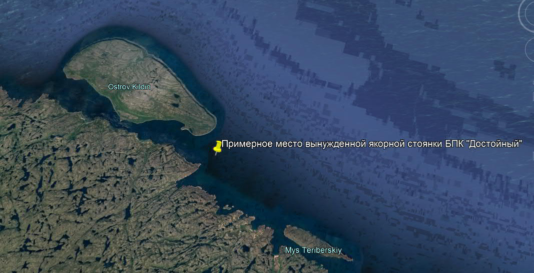 Примерное место вынужденной якорной стоянки корабля на входе в Кильдинский пролив.