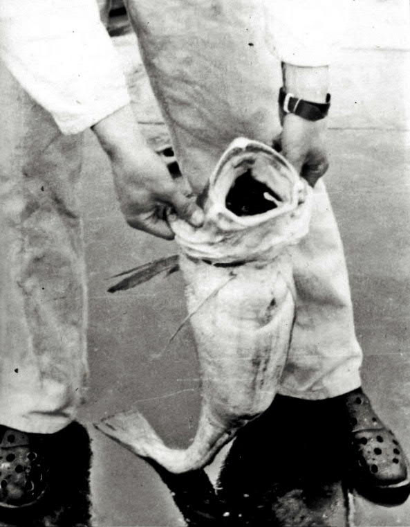 Иногда, время от времени, ловили на длинной толстой леске с большим крючком с любой, лишь бы не срывавшейся с него наживкой, рыб-прилипал. Эти рыбины вырастают длиной до одного метра и имеют на спине сразу позади головы своеобразный присосок овальной формы, с помощью которого прикрепляются к крупным морским обитателям, и кормятся всем, что достанется с их «барского стола». Некоторые из нас шутки ради прикрепляли рыб с помощью присоски на свое тело и фотографировались в таком столь экзотичном виде. Я же ограничился только экспериментами по их «прилипанию» к надстройке корабля.