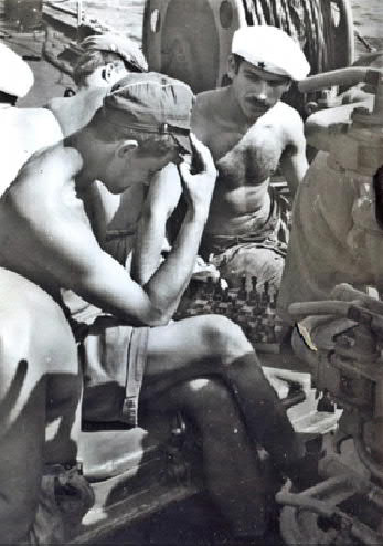 Сутки шли за сутками, ходовые вахты за вахтами. Помимо участия в корабельных мероприятиях, мы нашли для себя какие-никакие развлечения в свободное от служебных обязанностей время. Кто-то сделал из тетрадных листов бумаги самодельные карты и тайком от руководителя практики капитана 2 ранга В. Задуева резался на спички в покер; кто-то часами отсыпался в кубрике по старой курсантской привычке делать это при любом удобном случае и в любом удобном месте; кто-то развлекал себя игрой в шахматы на щелбаны.