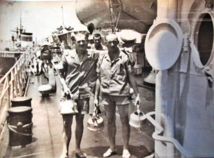 После помывки в корабельной бане ракетного крейсера «Грозный». Мои однокашники Николай Селеменев (на фото слева) и Николай Буточников с «добычей» пресной воды.