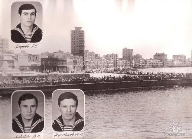 Набережная Гаваны во время нашей встречи. На фото из училищного выпускного альбома – мои однокашники, тоже участники похода на Кубу.